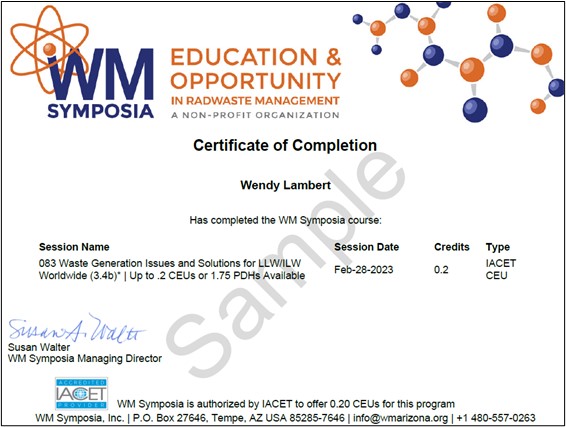 WM offers industry professionals (PE, PG, CHP, CSP, CHMM, PMP, and more) the opportunity to earn more than 25 professional development hours at the many technical sessions, panels, and roundtables. Workshops on Sunday are also eligible for professional development hours. Each eligible session will be identified in the on-line program later this year, with plenty of time to create your itinerary. Following the event, you can download a certificate of hours and submit to your certifying body. The certifying organization (e.g., Health Physics Society, State Board of Engineers, etc.) will need to validate it meets the organization’s definition of professional development hours.